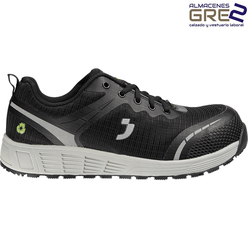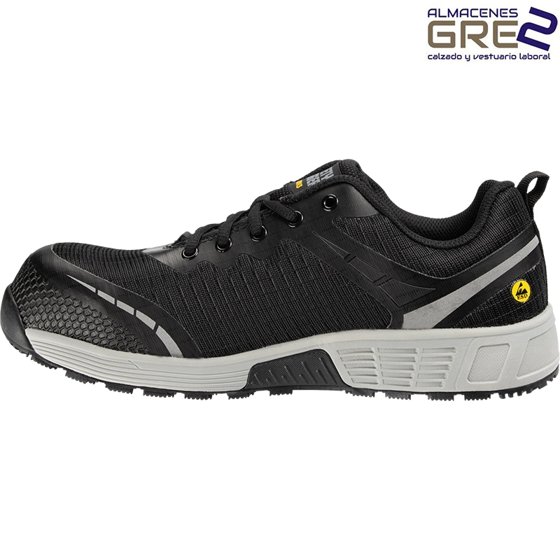 Cuenta con una puntera de composite, una suela resistente al aceite y al combustible y una parte superior transpirable.